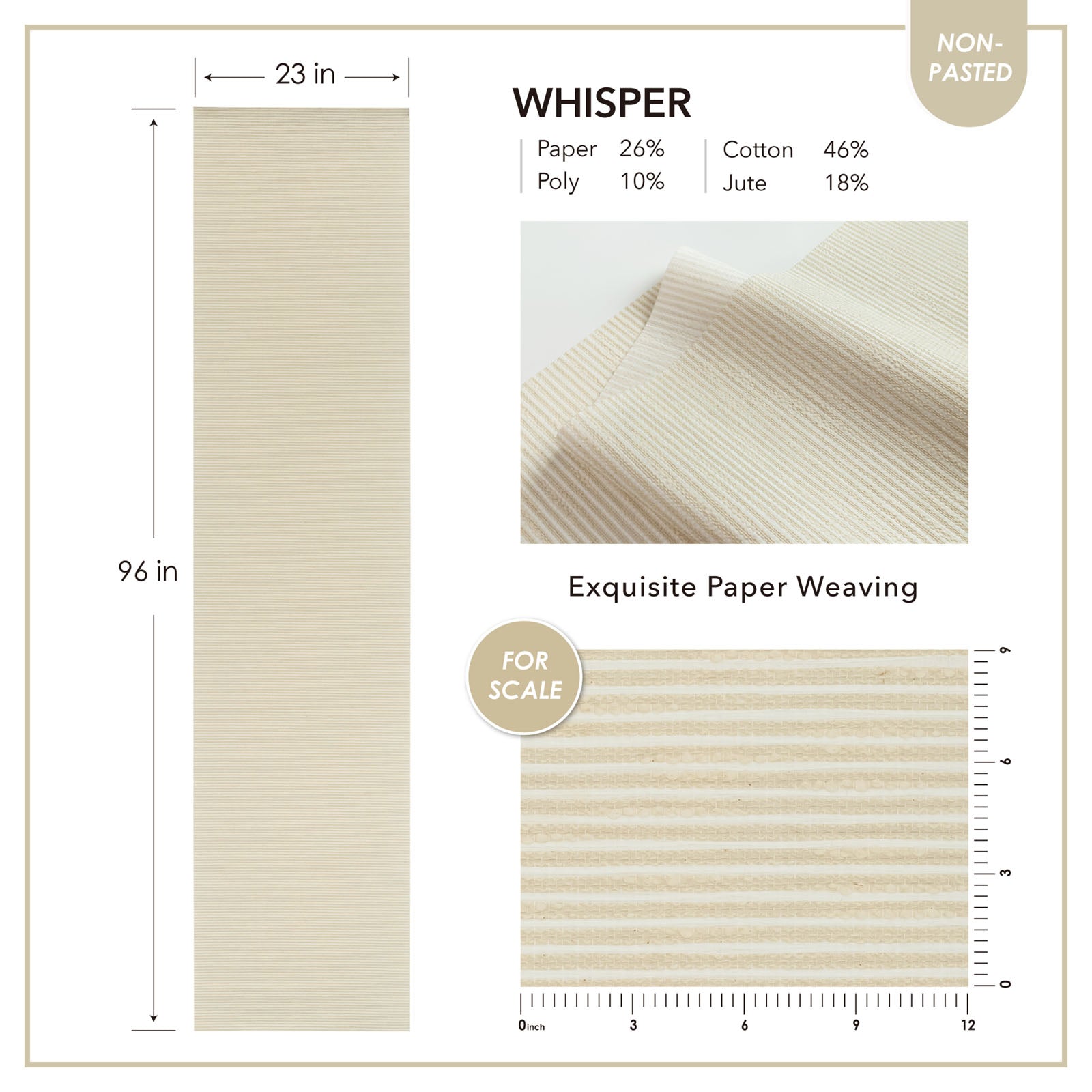 - Material: 46% Cotton + 26% Paper + 18% Jute + 10% Poly natural woven blended. All fabrics are non-pasted and require to apply adhesive by yourself.