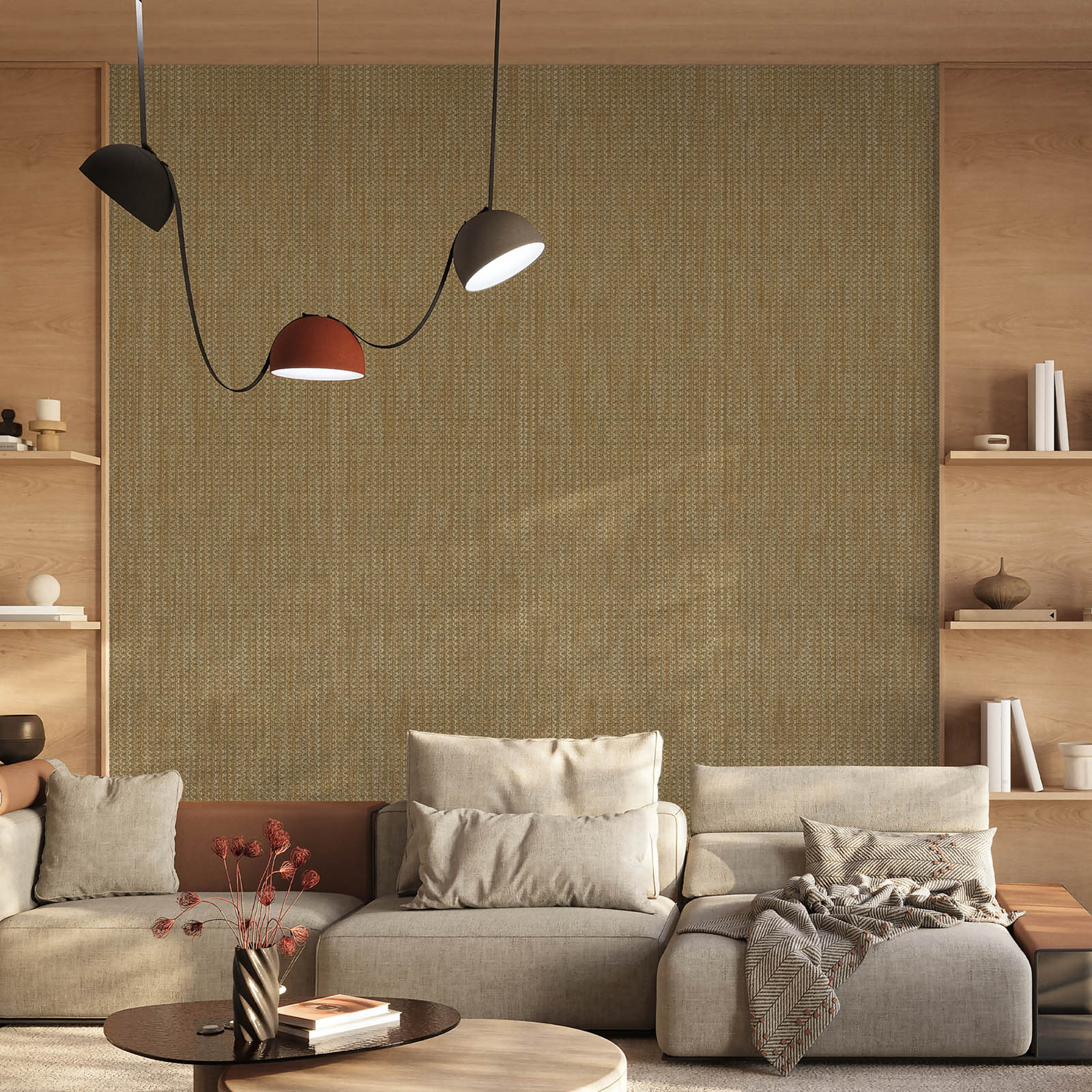 Cozy living room with woven textured wall, beige sectional sofa, wooden shelving with decorative objects, and natural light creating a warm atmosphere.