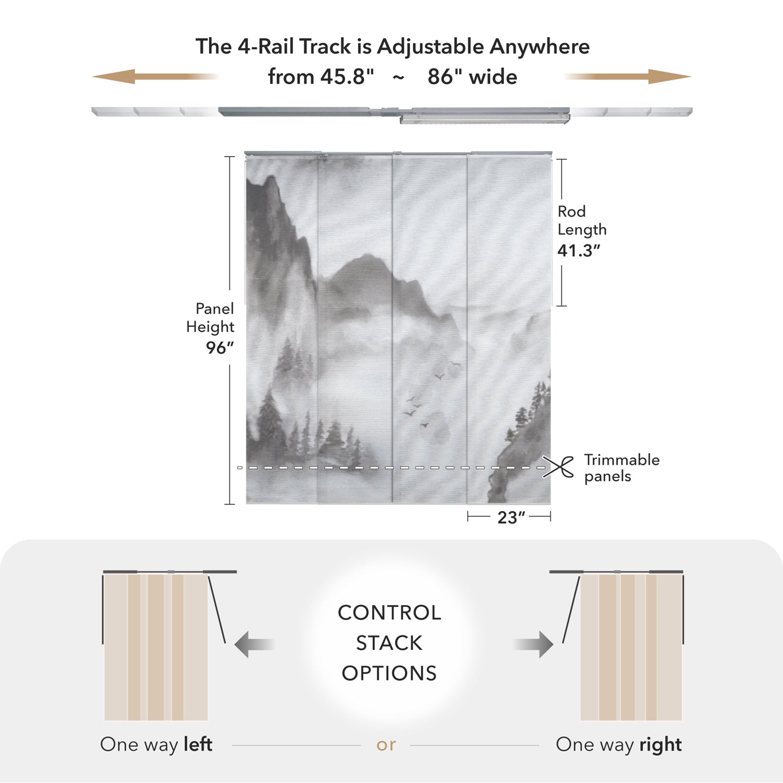 - 4-rail track is adjustable anywhere from 45.8” to 86” wide, the depth is 2.56”. Please refer to the size chart if your required width is wider than 86”.