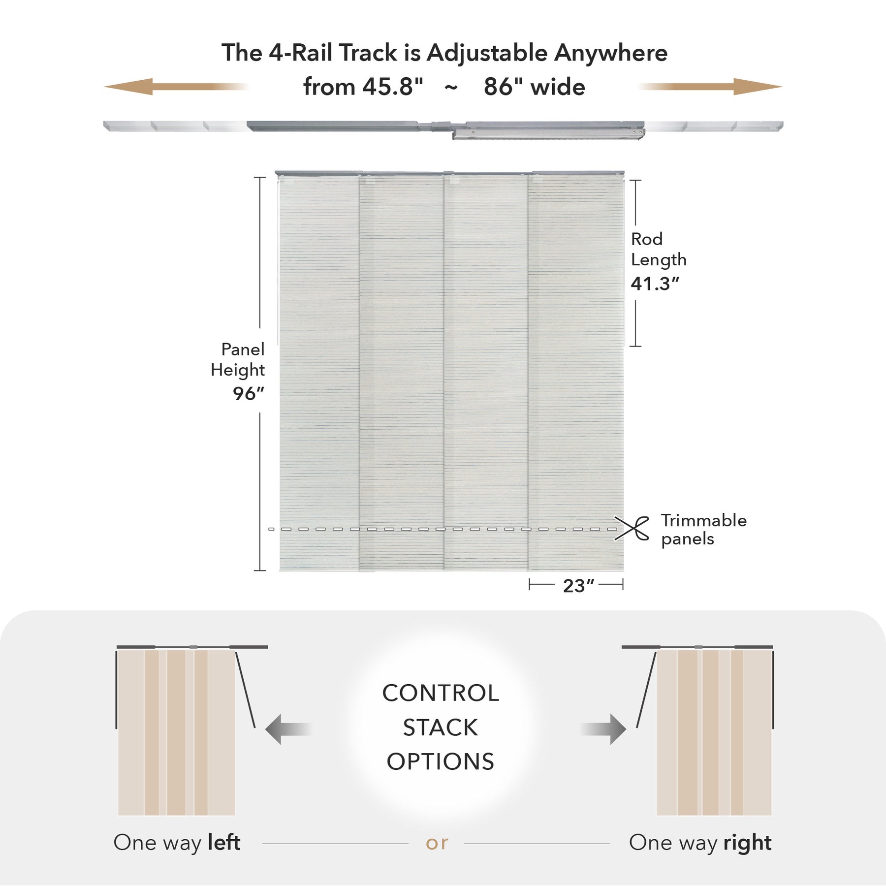 - 4-rail track is adjustable anywhere from 45.8” to 86” wide, the depth is 2.56”. Please refer to the size chart if your required width is wider than 86”.